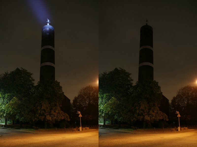 Auf dem Foto sieht man einen Kirchturm. Die Figur oben ist nachts kaum zu erkennen. Beide Fotos wurden mit den gleichen Einstellungen aufgenommen, F3,5 bei 15 Sekunden Belichtungszeit. Ich denke, der Unterschied ist deutlich zu erkennen. Die Entfernung der Figur bis zur Kamera ist ca. 50 Meter. Unten die Straße wird von der Straßenbeleuchtung aufgehellt, die immerhin auch mit ein paar hundert Watt strahlt.