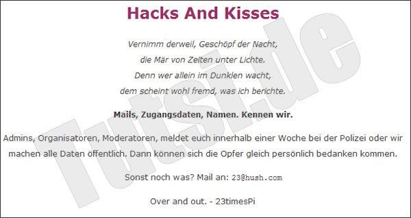 Eine Gruppe die sich 23timesPi nennt, hat anscheinend isharegossip.com gehackt und stillgelegt. Sie fordern die Betreiber auf, sich binnen einer Woche der Polizei zu stellen, ansonsten werden ihre Daten, Emails etc.pp. veröffentlicht.